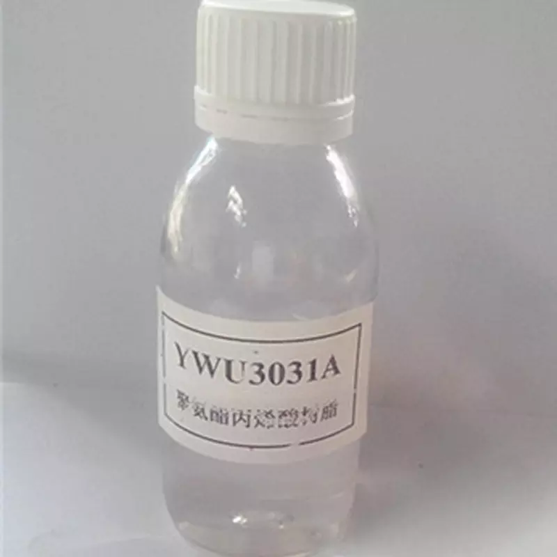 YWU3031A is a monofunctional aliphatic polyurethane acrylic resin oligomer with a molecular weight ranging from 925 to 1250. It has low molecular functional groups, balancing toughness and crosslinking curing speed. It has strong adhesion and exhibits excellent macroscopic properties, such as excellent toughness, adhesion, quick drying, high gloss, resistance to yellowing and chemical resistance. Due to the presence of acrylic double bonds in the main functional groups, it can be radiation-cured or chemically crosslinked. The product has a light and transparent color, balanced flexibility and hardness, scratch resistance, high gloss without yellowing. It has a wide range of applications. It can be used alone as the main resin for UV one-step adhesives, UV-curable coatings, inks and adhesives, etc., and can also be mixed with other acrylic systems, epoxy, polyurethane, nitrocellulose, etc. For improving the adhesion and crosslinking speed of difficult-to-adhere substrates such as PET, PC glass, etc., as well as enhancing the bonding strength and yellowing resistance transparency, it has significant effects.